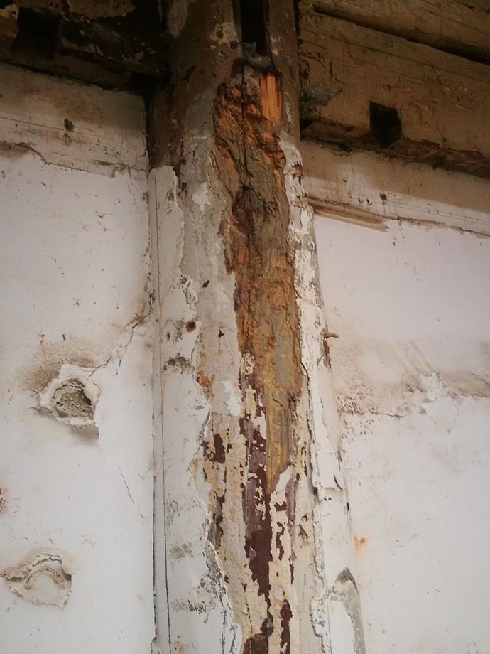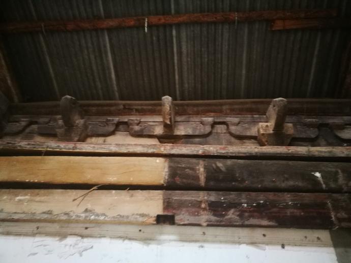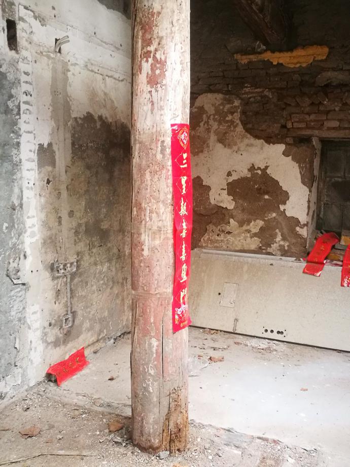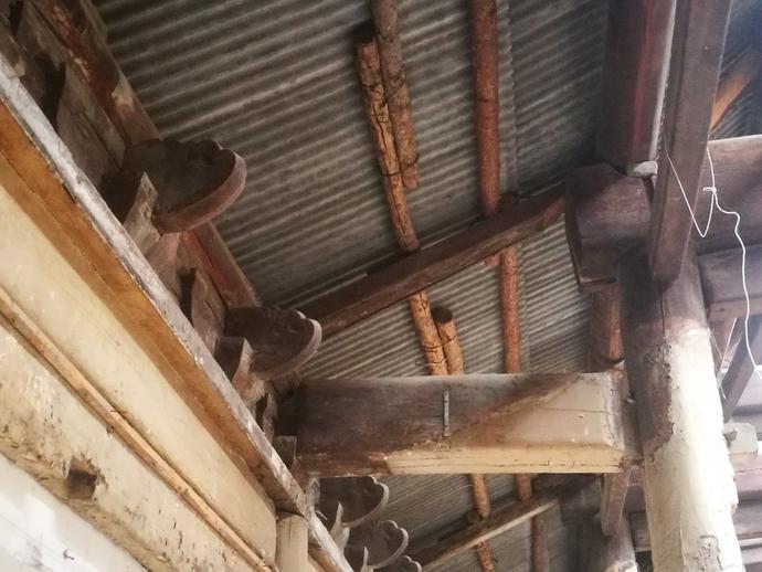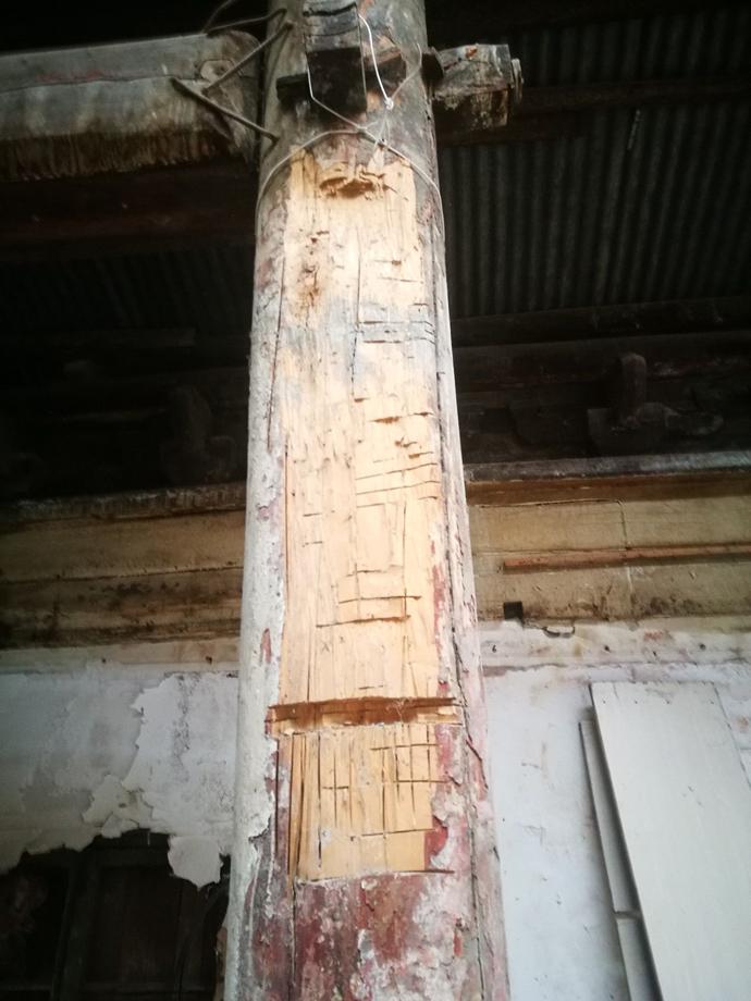 比較年歲久遠(yuǎn),生活日報(bào)記者看到,有些原木的地步已經(jīng)腐爛,有的很比較嚴(yán)重。而且大殿的內(nèi)側(cè),能夠看到有裝修過的痕跡,很多的現(xiàn)代建筑材料也和這些砍成文物的老建筑粘在一起。墻壁非常的殘破,有修補(bǔ)的痕跡,很多地方露著磚塊。