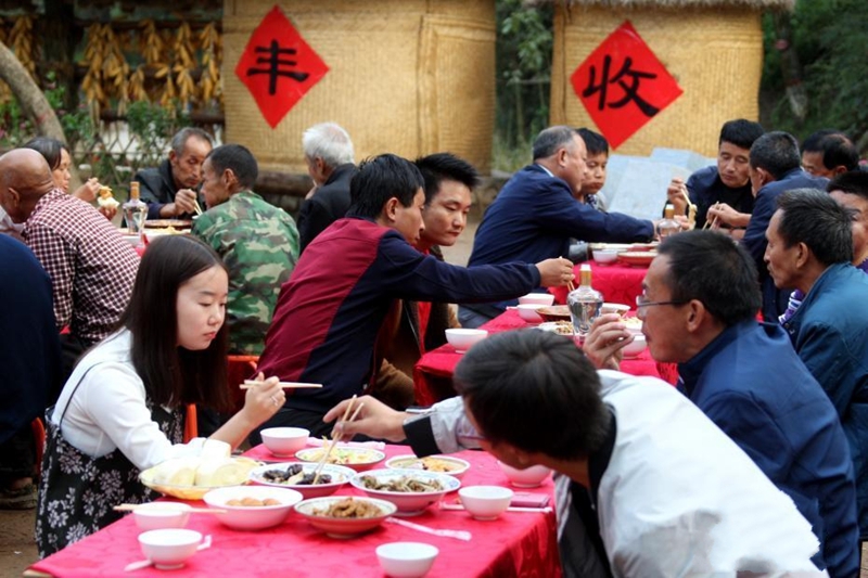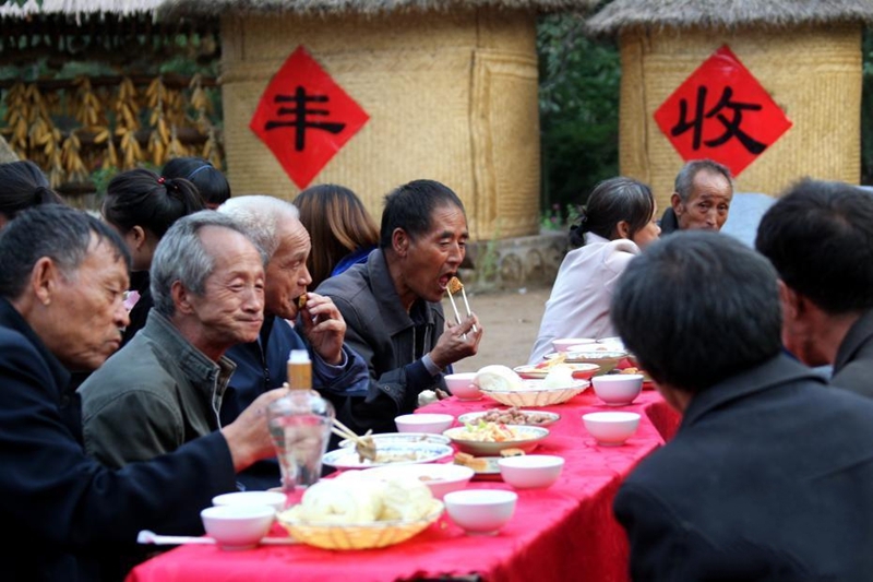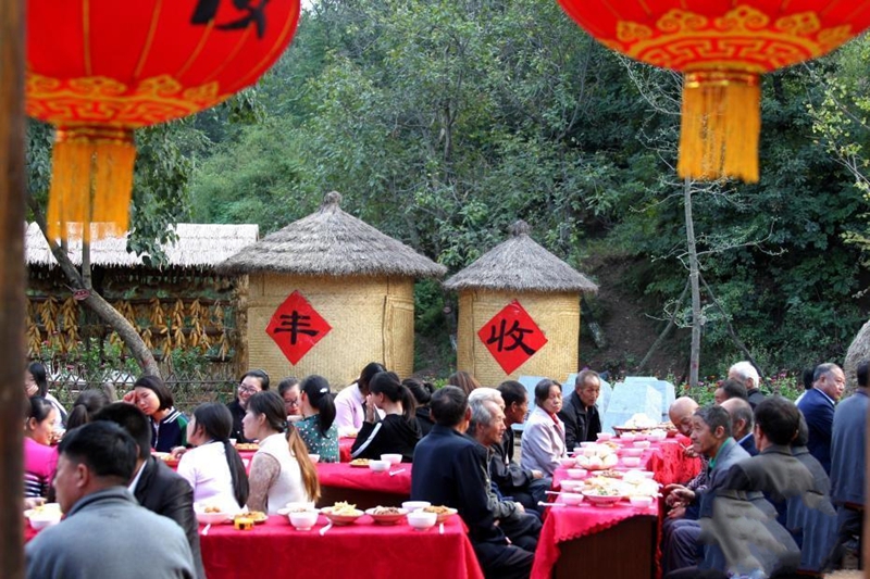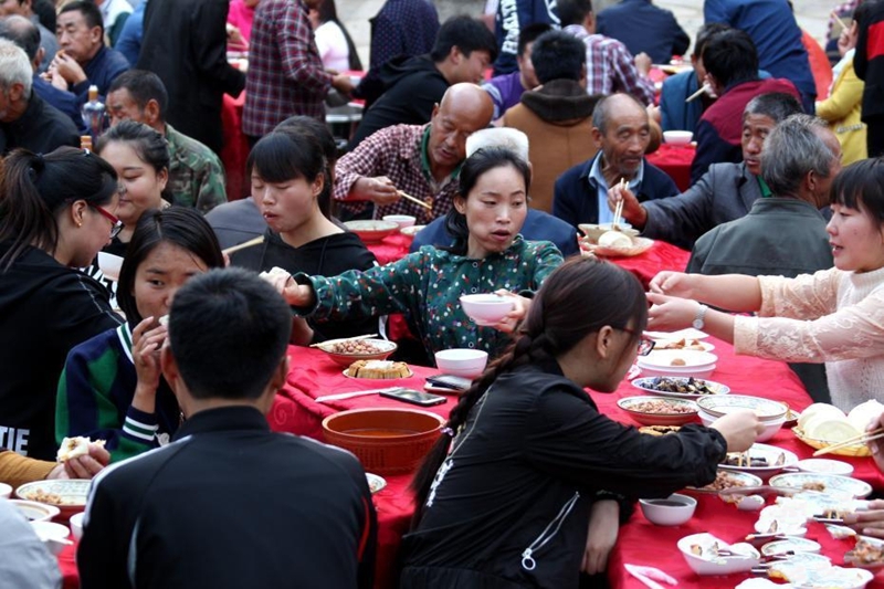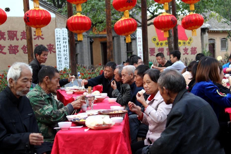 9月29日傍晚,國(guó)慶前夕,河南省盧氏縣新坪村張燈結(jié)彩,百余村民們圍坐于村委會(huì)門前的百草園廣場(chǎng),他們拿出自家的拿手好菜,手工牛肉丸、熬炒柴雞、山水老豆腐、粉蒸紅薯葉、清炒香菇、清蒸南瓜等幾十樣的特色美食。聚在一起吃“百家宴”,話家長(zhǎng)里短,擺放著美食的桌子圍成了巨大的“國(guó)慶”字樣,場(chǎng)面十分壯觀。