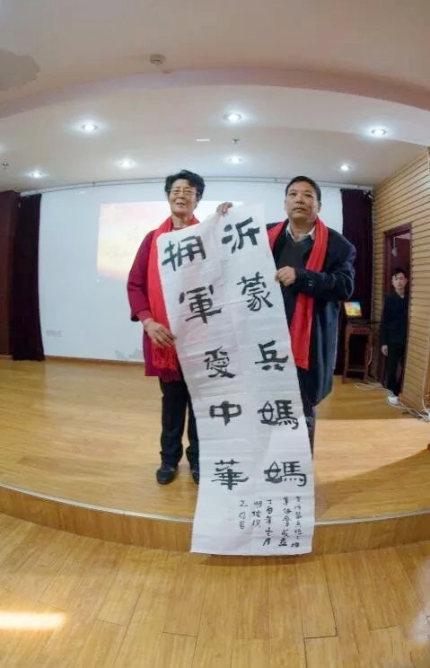 沂蒙兵媽媽擁軍協(xié)會還得到了王俊慶、徐仰平、徐以松劉乃沂、劉乃義、胡發(fā)釗等老同志的大力支持,知名人士女子水晶樂坊、大衣哥朱之文、草帽姐徐桂花、金波、王紅蘭、卞小貞、魏金棟、王迅、來喜、付高峰、劉大成、旭日陽剛、好弟、王海地、魏震、山楂妹張月喬、王小虎、段煉、孫美貞、云飛、玖月奇跡、陽光等發(fā)來賀電及祝賀視頻。王飛躍代表中國人民解放軍總參謀部書法院院長王學(xué)嶺、潘明信代表山東美協(xié)會員周先明向大會贈字。
